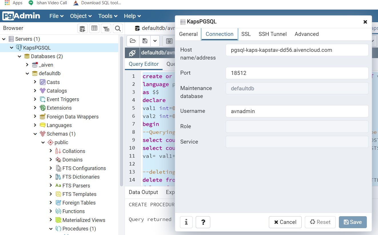Download service.key, service.cert and ca.pem in local drives from Aiven Console on server (say ./home/) and change the above path appropriately. Replace the appropriate URI in the service uri parameter too. Pass postgresql log & password for the URI provided by Aiven Console as colon (:) separated string.