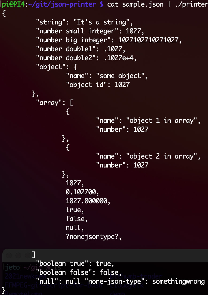 json-printer Simple printer for json-like texts installation git clone https://github.com/kcoms555/json-printer cd json-printer gcc main.c -o printer usage cat sample.json | ./printer