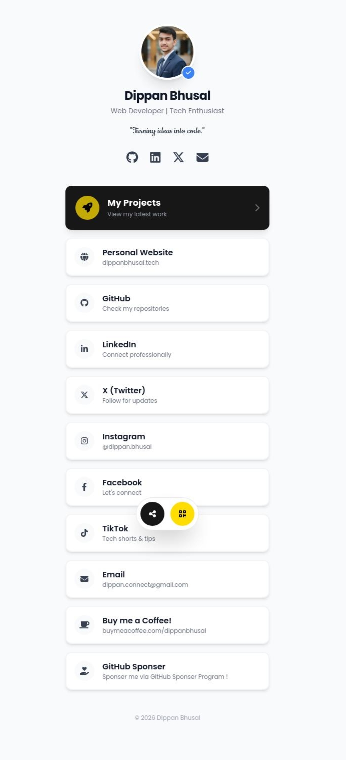 Connect is a modern, responsive "Linktree-style" contact hub and project showcase designed for developers and creators. Unlike generic link-in-bio tools, this project offers full control over design, SEO, and analytics.