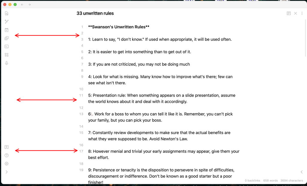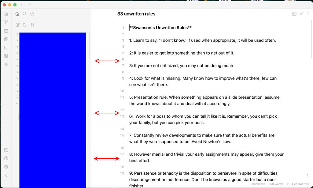I'm new to Obsidian, found your theme in the list and liked it. Not running any plugins in these screenshots, but same look with a few plugins I've tried enabled as well, so no change there. I'm using a M1 MBA MacOS 15.0.1, and Windows 10 system, including screen shots from both. I did blue out my folder names for privacy. The red arrows indicate the space I want to shrink. I tried various settings but none of them seems to make it any smaller, or larger. Sorry line numbers weren't enabled in Windows, I forgot to turn them on. I compare the space of the gap to the digits in line numbers. It looks like I have space to go up to the millions or more! I'd rather that space be used to present more text. If I'm doing something wrong, please feel free to tell me. Mac: Windows: |