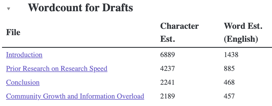 This could be very interesting, since then you could very easily create a table with the wordcount of every scene via dataview. Doing so also would not be very hard, as it is basically prepending the results of wc on every file.