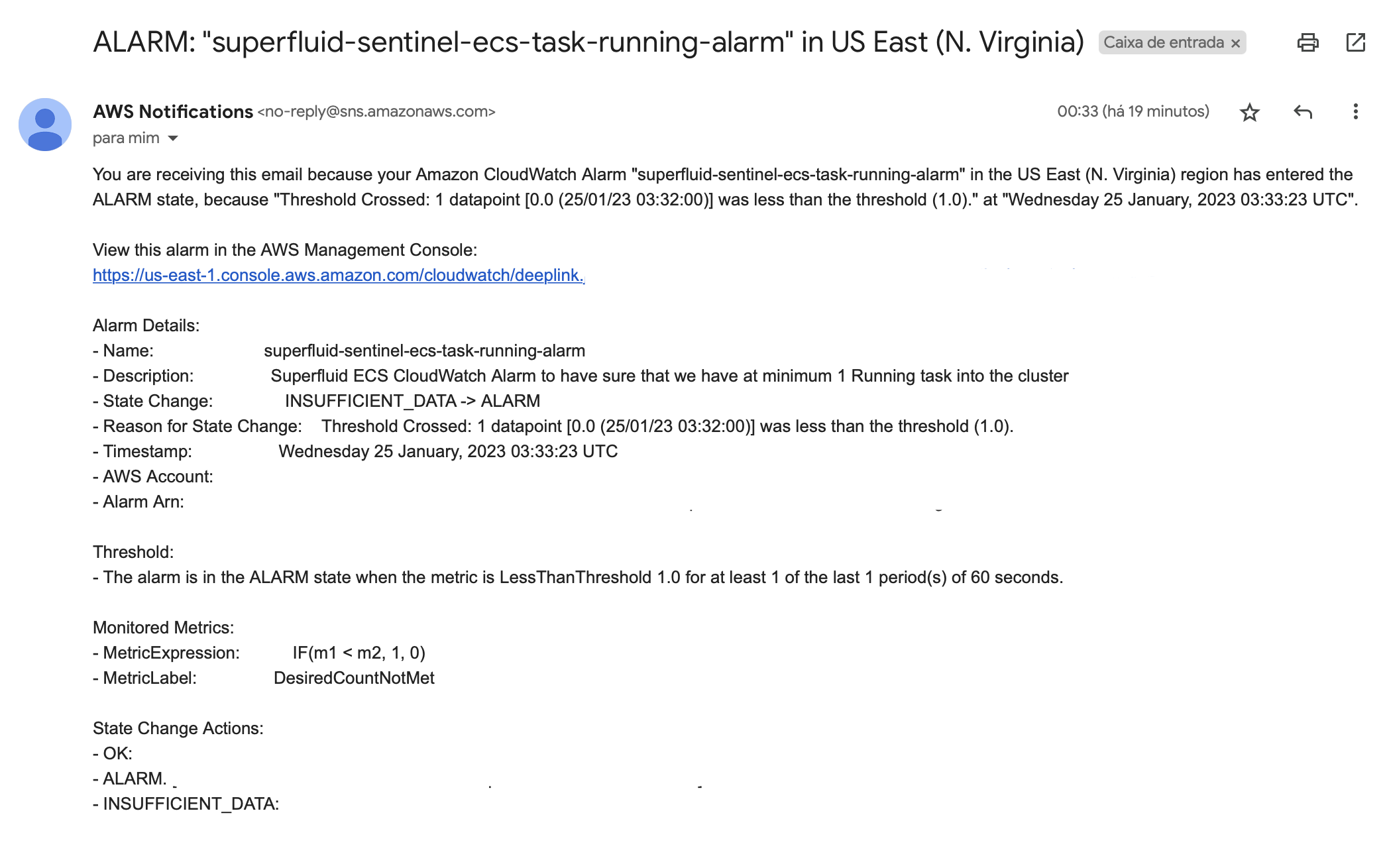 Example of the AWS e-mail when our Sentinel's image is not "Running" into our ECS Cluster
