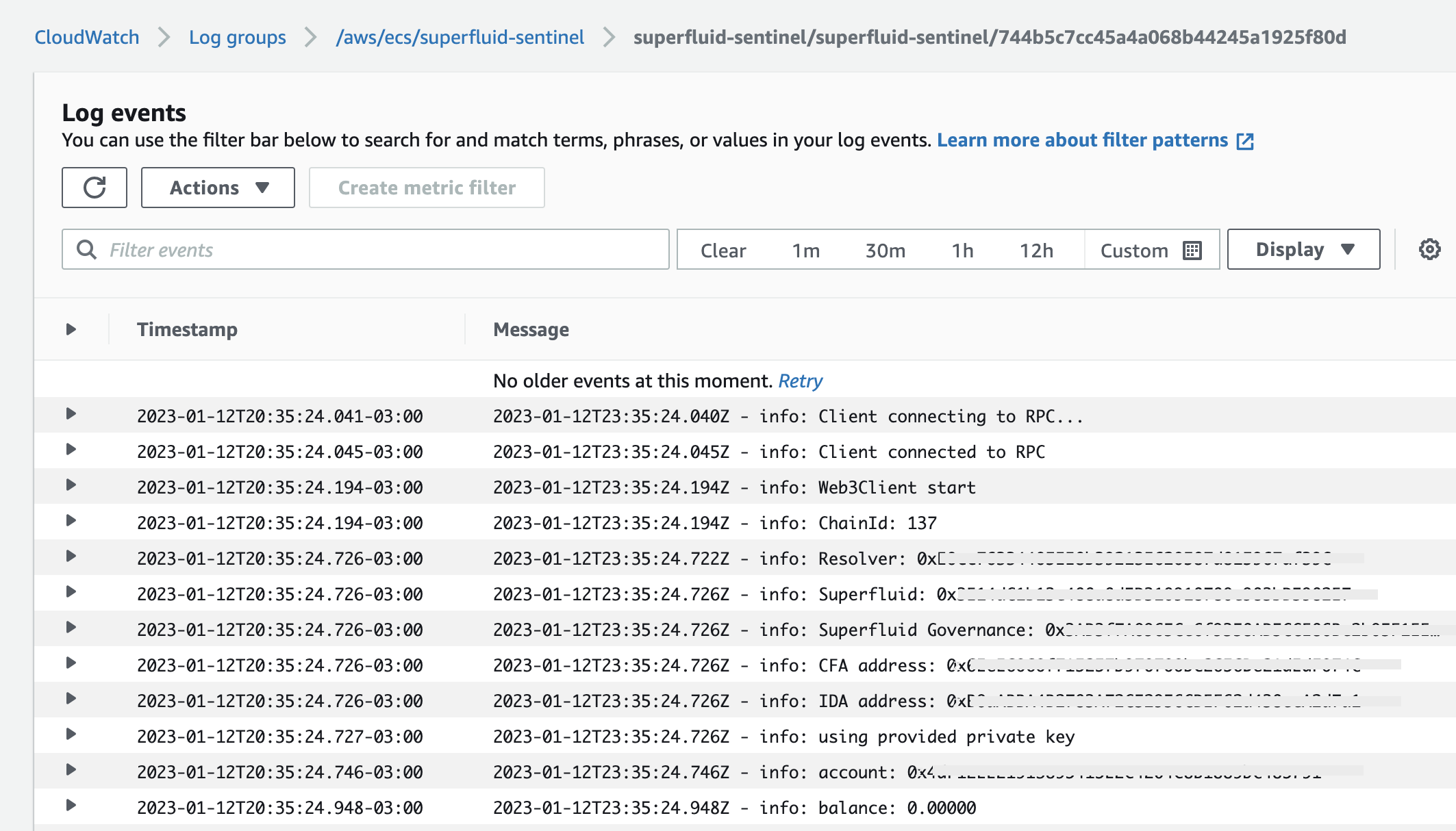 One of the most important things related to the Superfluid Sentinel is the Log visualization. For this reason, i also deployed a private CloudWatch Log Group for our ECS app. This way we can check the logs in real time.