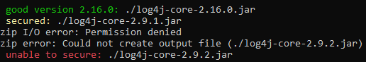 In case someone might be interested: I wrote a shell script to remove log4shell relevant classes from all log4j jars in the file system. https://stackoverflow.com/a/70362694/1948252 In this example the last file was readonly, thus the red notice. |