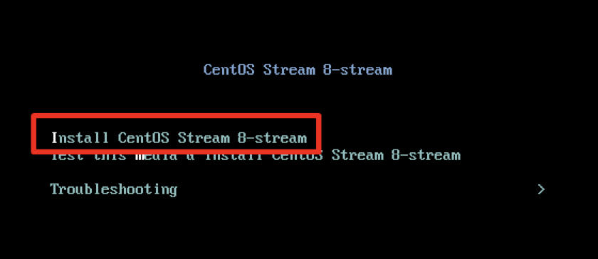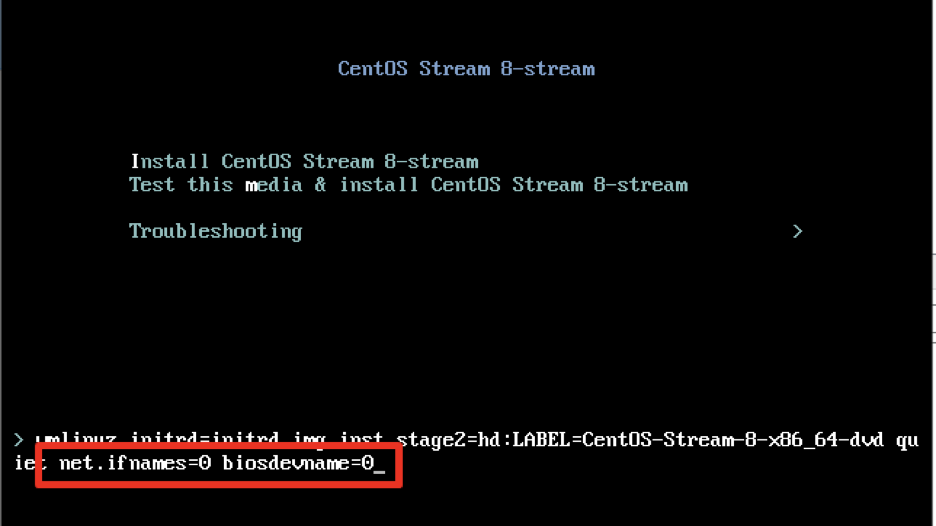 During the installation of the CentOS OS. Move to Install CentOS Stream 8-stream and click tab on your keyboard.