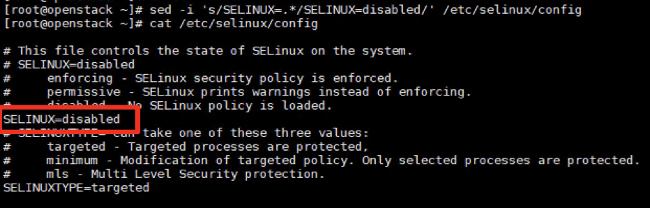 sed -i 's/SELINUX=.*/SELINUX=disabled/' /etc/selinux/config