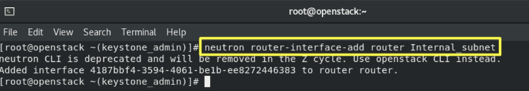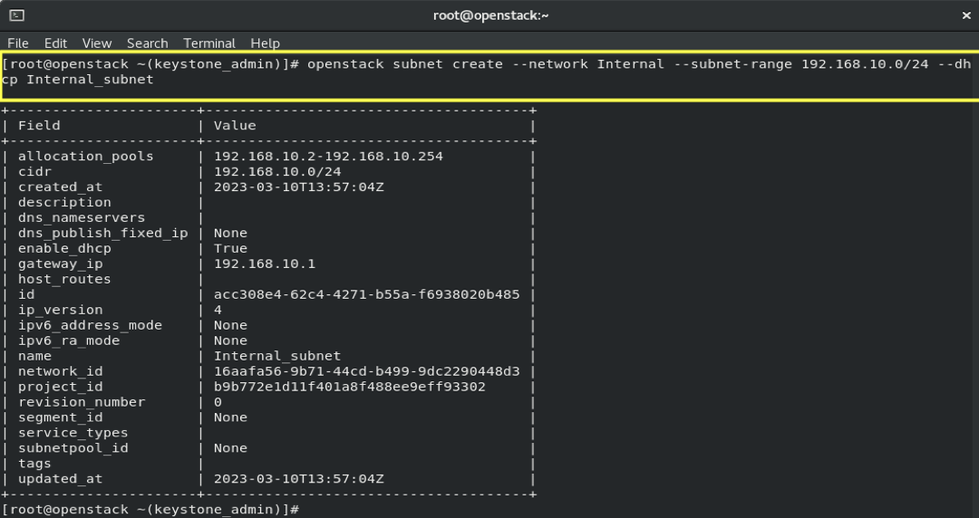 openstack subnet create --network Internal --subnet-range 192.168.10.0/24 --dhcp Internal_subnet