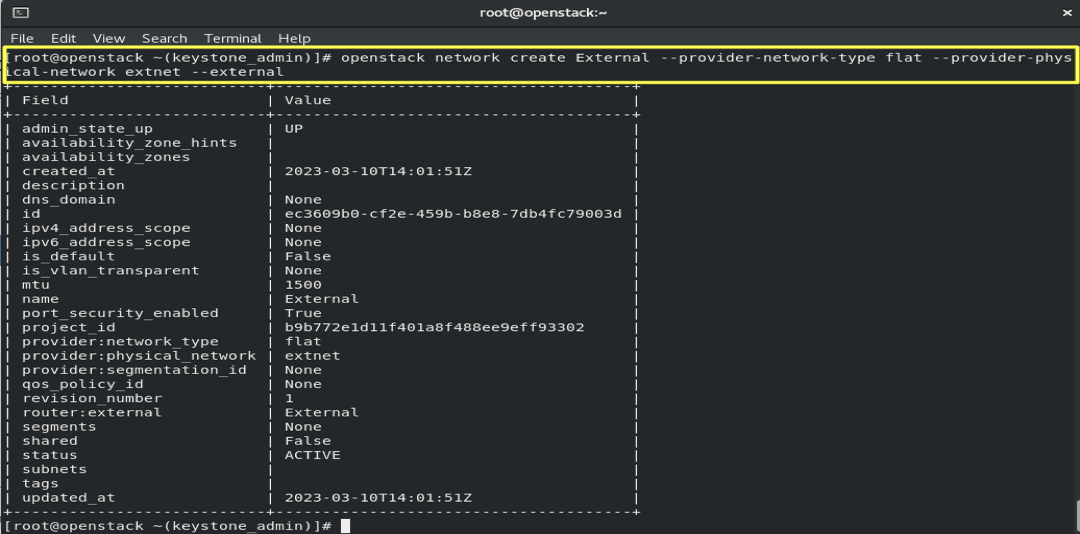 openstack network create External --provider-network-type flat --provider-physical-network extnet --external