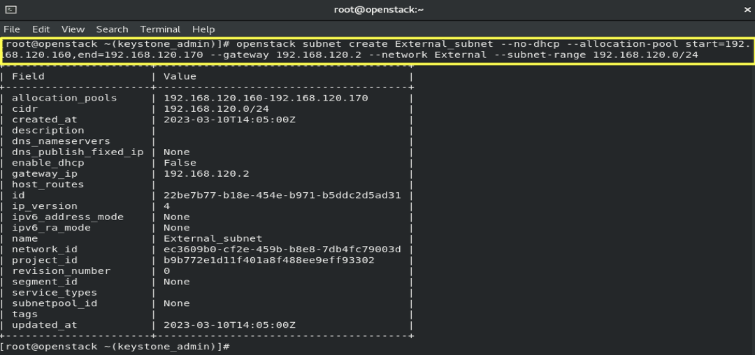 openstack subnet create External_subnet --no-dhcp --allocation-pool start=192.168.120.160,end=192.168.120.170 --gateway 192.168.120.2 --network External --subnet-range 192.168.120.0/24