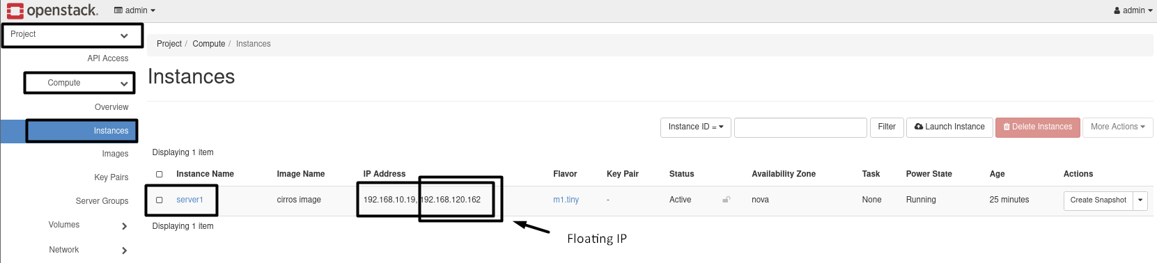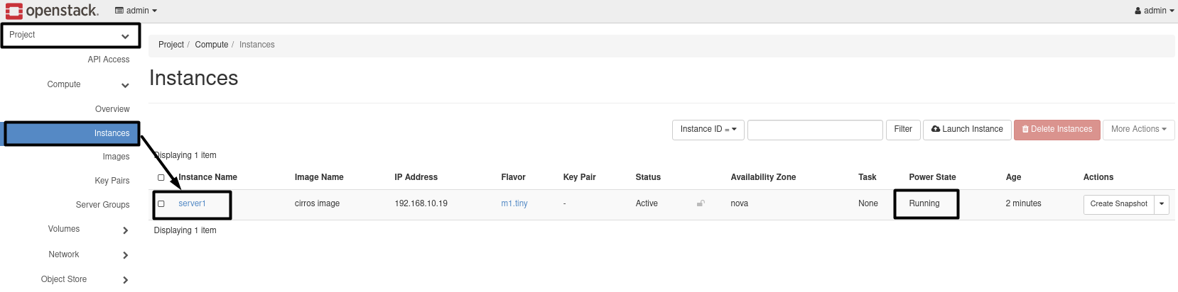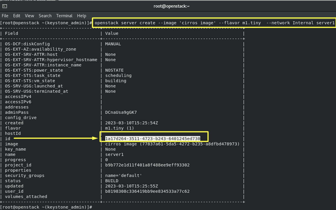 openstack server create --image 'cirros image' --flavor m1.tiny --network Internal server1