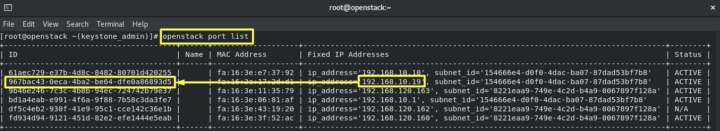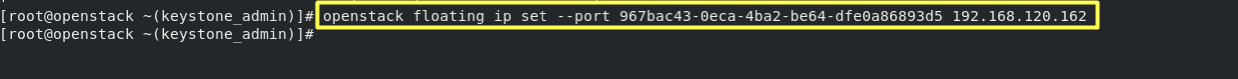openstack floating ip set --port 967bac43-0eca-4ba2-be64-dfe0a86893d5 192.168.120.162