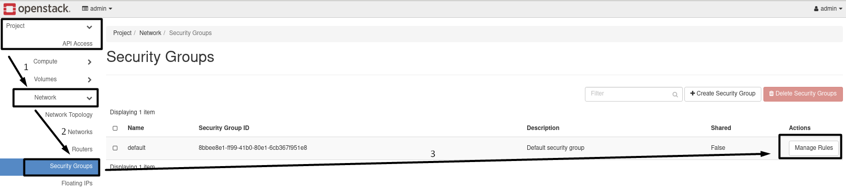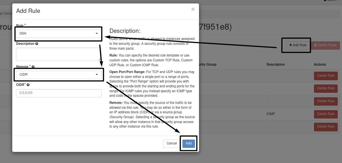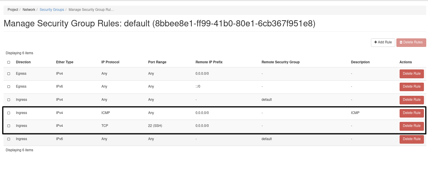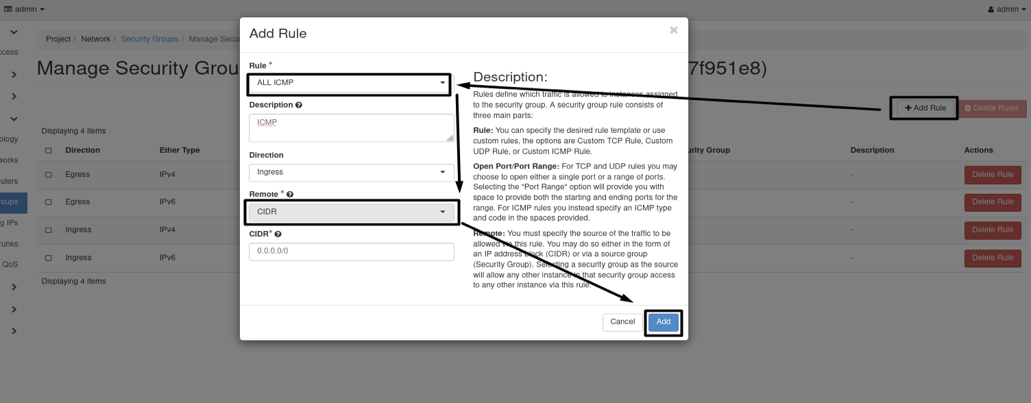 7.4- Add two rules in the default security group to enable ssh port and ICMP Project => Network => Security Groups => Manage Rule