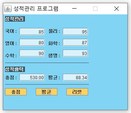 설계목적 계산기와 같은 기능을 하며 성적합산에 좀더 편리한 프로그램 만들기 계산기를 이용하지 않고도 손쉽게 평균을 구해주는 프로그램 만들기 주요기능 성적을 입력한 후 총점 버튼을 누르면 입력한 성적의 합계를 출력한다. 성적을 입력한 후 평균 버튼을 누르면 입력한 성적의 평균을 출력한다. 리셋 버튼을 누르면 입력한 값과 출력한 값 모두 지워진다.