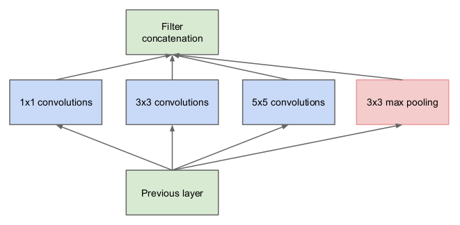 def naive_inception_module(x, filters): z1 = Conv2D(filters=filters[0], kernel_size=1, strides=1, padding="same", activation="relu")(x) z2 = Conv2D(filters=filters[1], kernel_size=3, strides=1, padding="same", activation="relu")(x) z3 = Conv2D(filters=filters[2], kernel_size=5, strides=1, padding="same", activation="relu")(x) z4 = MaxPool2D(pool_size=3, strides=1, padding="same")(x) return Concatenate(axis=-1)([z1, z2, z3, z4])