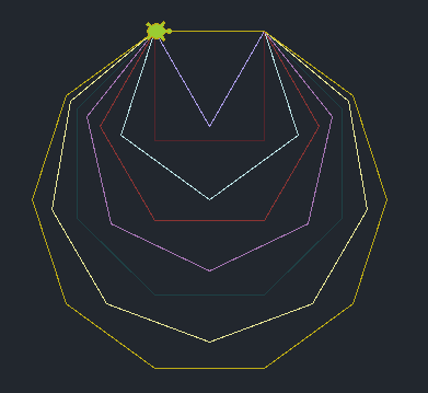 else : tim.pendown()- Make him draw different shapes with random colors, one on top of the orher: