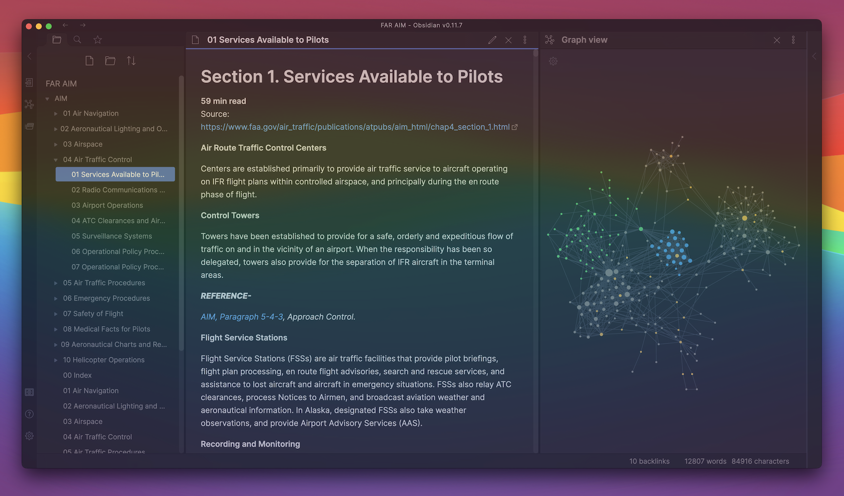 The most comprehensive (and I think only) Obsidian toolkit for aviation-related topics. Includes up-to-date copies of Federal Aviation Regulations (FAR), Aeronautical Information Manual (AIM), and the Pilot/Controller Glossary with more coming soon. This makes it a lot easier to consume and jump around in. This is a huge improvement over the past where you had to either own a physical copy, navigate cumbersome government websites, or find a good PDF.