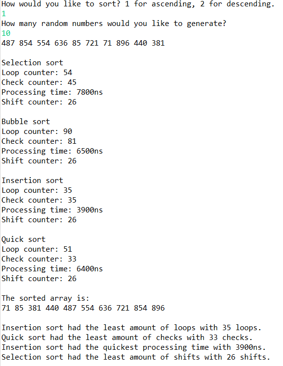 Tests 4 different methods of sorting (selection, bubble, insertion, quick) and finds the most efficient one in 4 different categories. Compares how many loops, shifts, and checks each sort performs in addition to how fast their processing time is and outputs the most efficient in each category. Allows the user to choose how many numbers they would like randomly generated. Also asks the user if they would like it to be sorted in ascending or descending order.