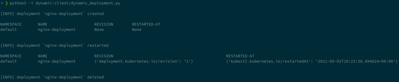 examples/dynamic-client/deployment_rollout-restart.pypython script, to demonstrate how to perform a rolling restart on a deployment resource.The output of the script looks like: