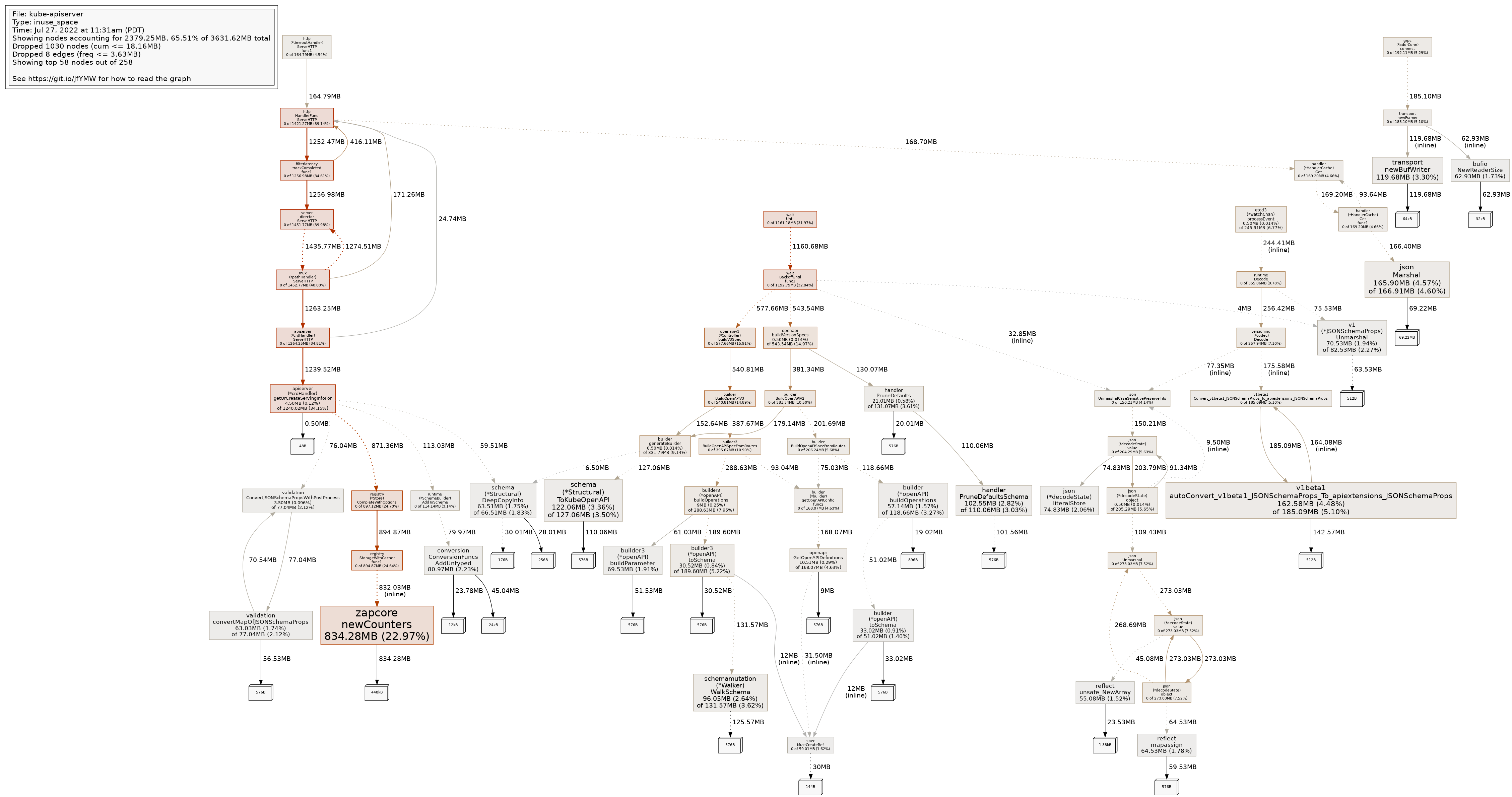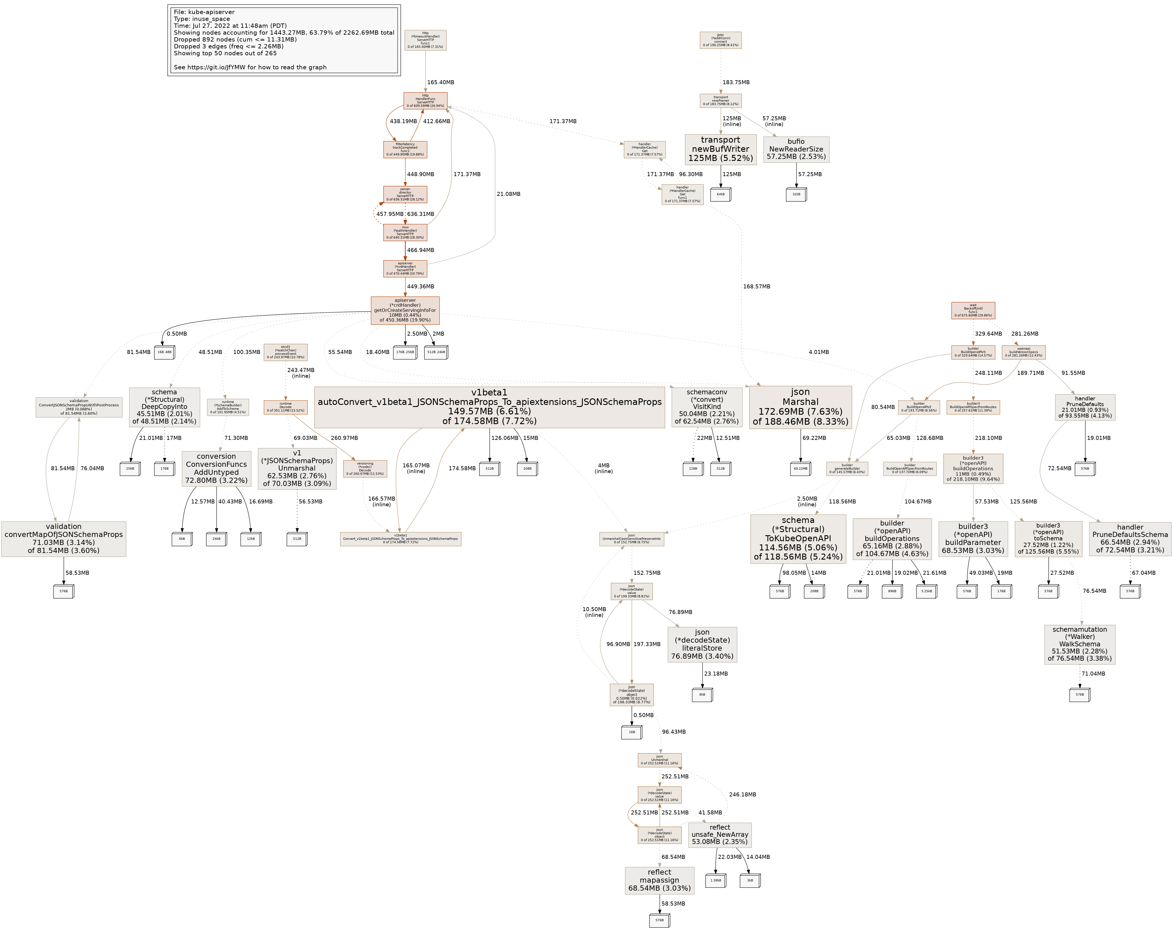 kind build node-image .to build a kind node.kind create cluster --image kindest/node:latestto start a control plane for the above build.kubectl apply -f https://raw.githubusercontent.com/negz/crossplane-scale/dc25bef/profile.yamlto allow anonymous pprof accesskubectl apply -fthe CRDs from https://github.com/negz/crossplane-scale/tree/dc25bef/etoomanycrds/latest-crdsgo tool pprof -png https+insecure://localhost:$(kind get kubeconfig|grep server|cut -d: -f4)/debug/pprof/heapI used https://github.com/nicolargo/glances to see the RSS but I imagine