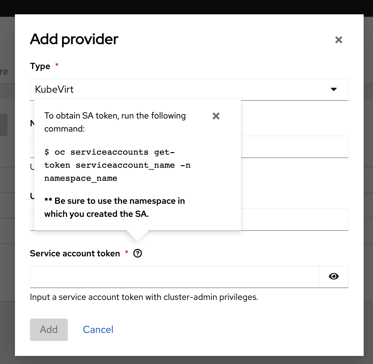 This PR adds some description text and updates the popover text for the service account token field in the add provider modal. Should help close #751 and bz-1994042.