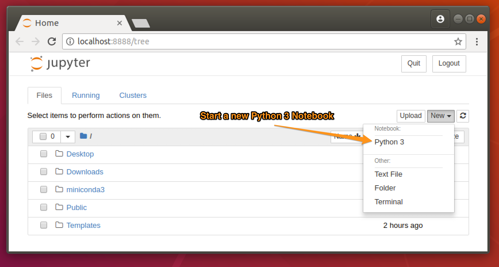You should now be good-to-go. To verify this, please type jupyter-notebook in the Terminal (or 'Anaconda Prompt'). A browser window should open and you should be able to start a new Python 3 Notebook: