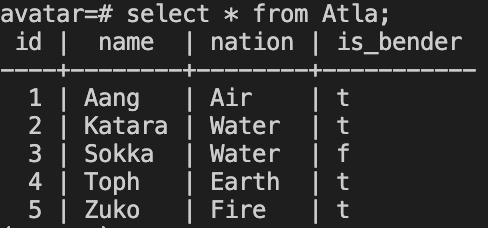 The data can be seen in the psql database with the name "avatar" and in the table "Atla". Once in the database (\c avatar), users can do "SELECT * FROM Atla;" to see the characters and their information.