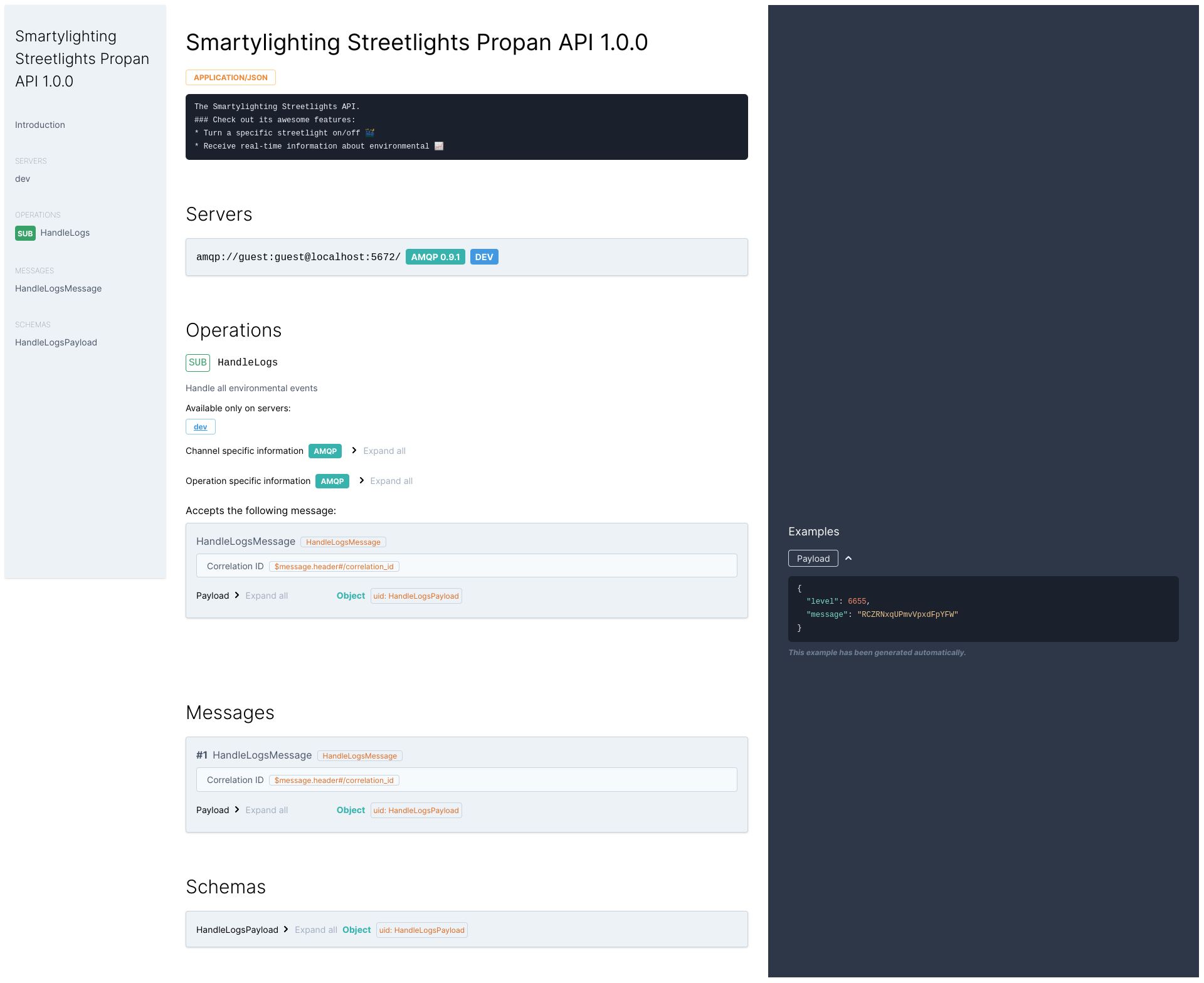 ) == "pong"Propan automatically generates documentation for your project according to the AsyncAPI specification. You can work with both generated artifacts and place a Web view of your documentation on resources available to related teams.