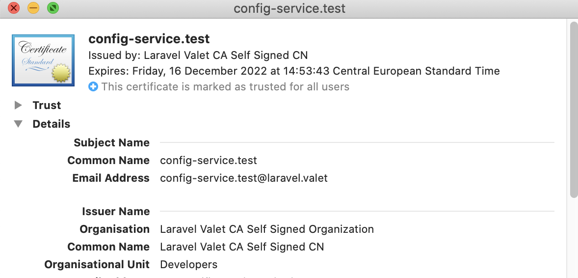 expireIn$ valet unparkexpireIn,$ valet secure --expireIn=120 <my_laravel_project>Extra test is done by checking Mac's Keychain Access for default option, 368 days counting from December 13 2021
