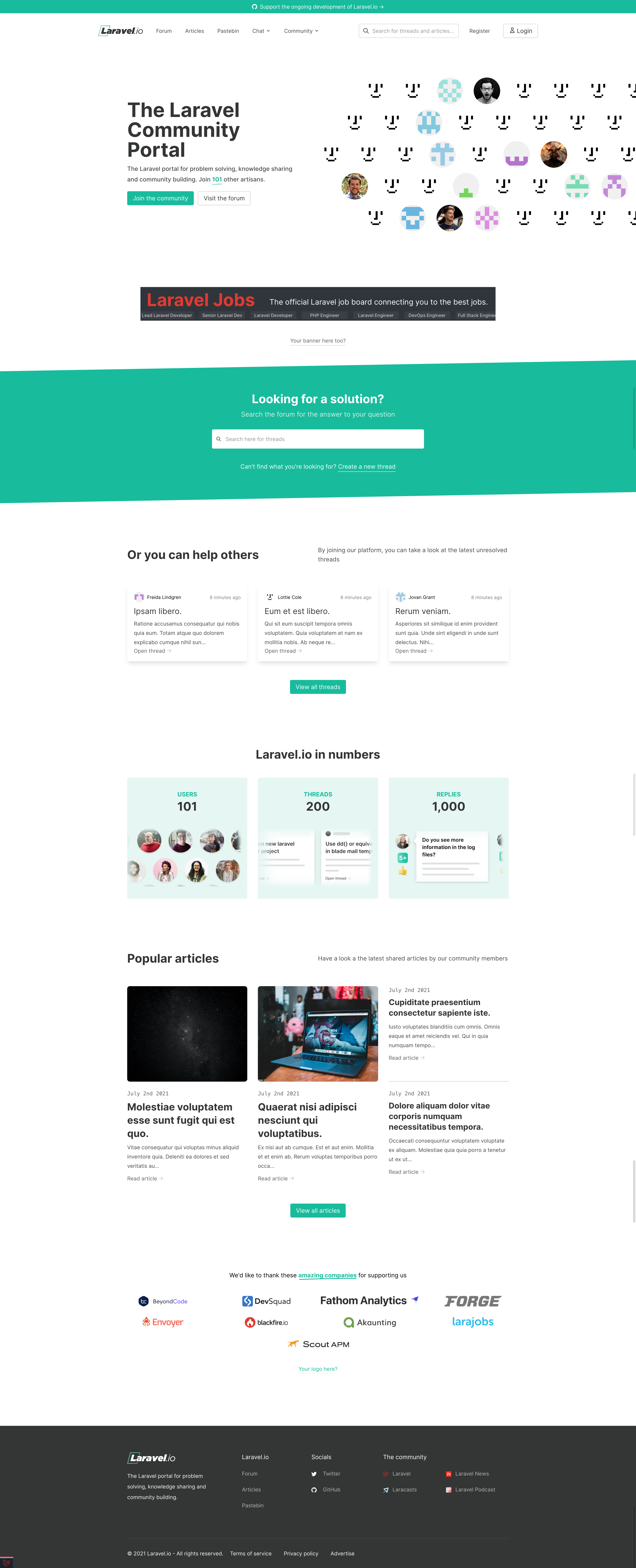 The gaps between the boxes of "Or you can help others", "Laravel.io in numbers" and "Popular articles" can be a bit wider. Overall I also have the feeling that these section's container isn't as wide as the design. Feels a bit squished.