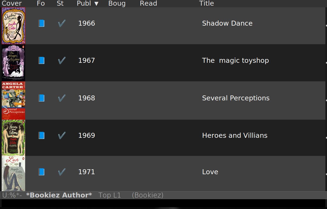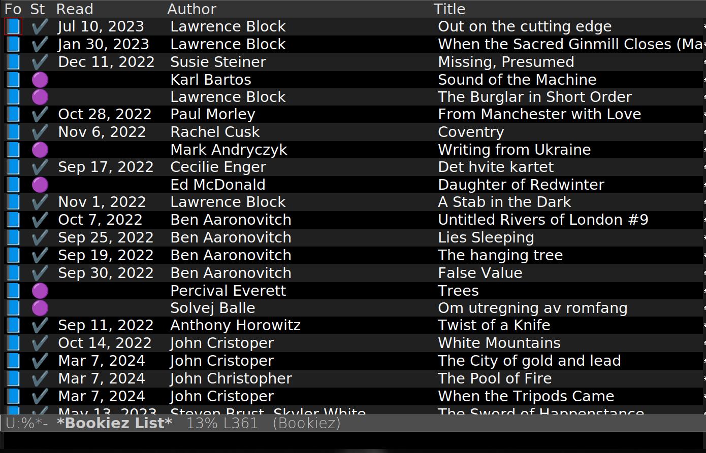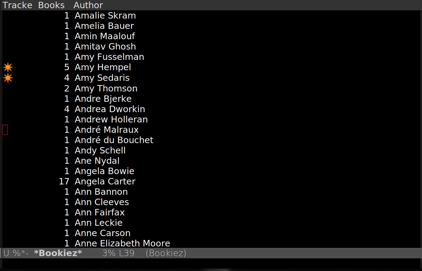bookiez is an Emacs package for keeping track of books you own. The basic idea is that you enter ISBNs, and then bookiez queries various ISBN lookup providers, and then stores the information.
