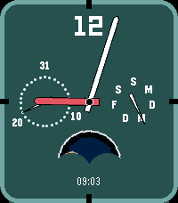 - Right Subdial: Day of week indicator (S-M-D-M-D-F-S).