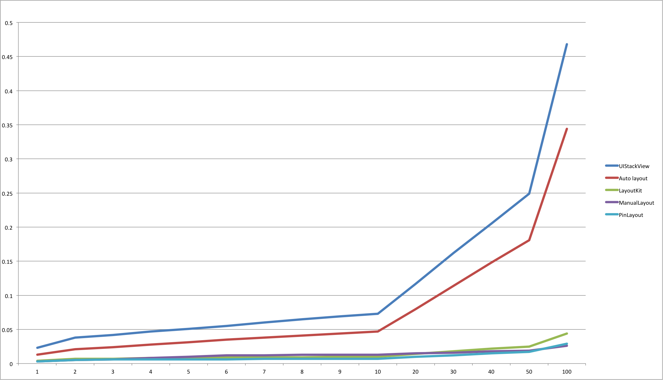 As you can see in the following chart, PinLayout's performance is as fast as manual layouting, and up to 12x faster than auto layout, and 16x faster than UIStackViews. LayoutKit is also realy fast, slightly slower than PinLayout and manual layouting.