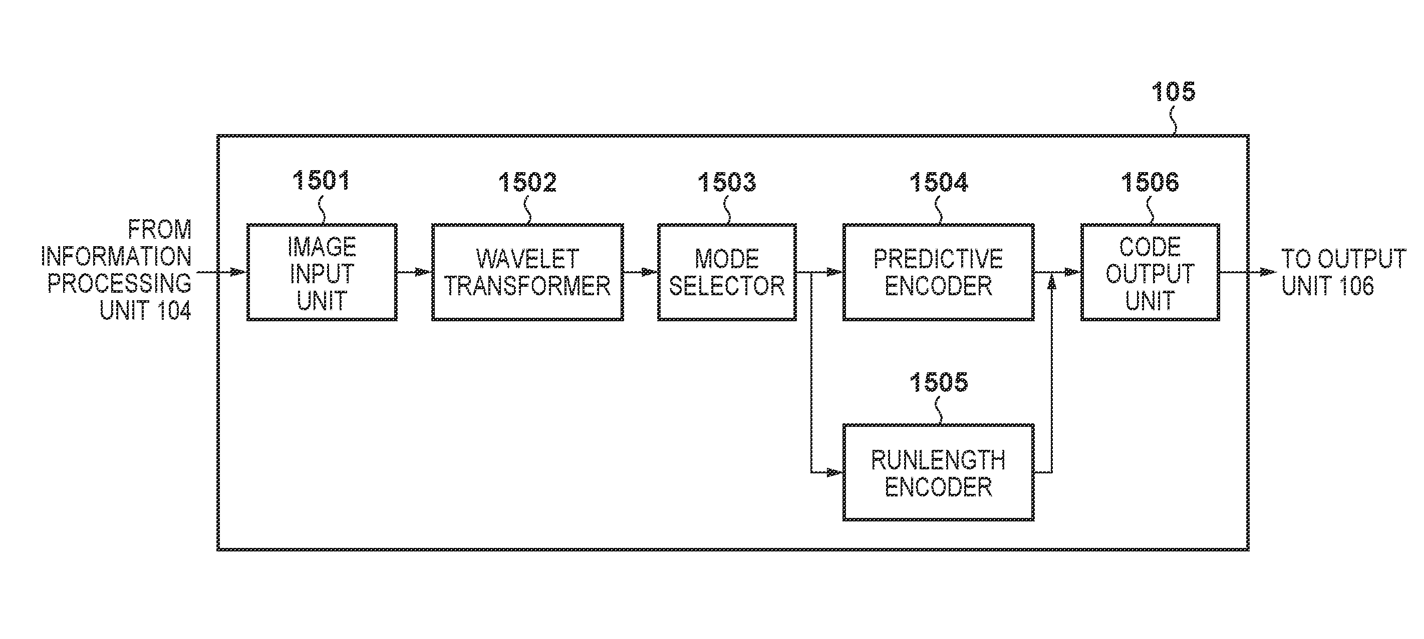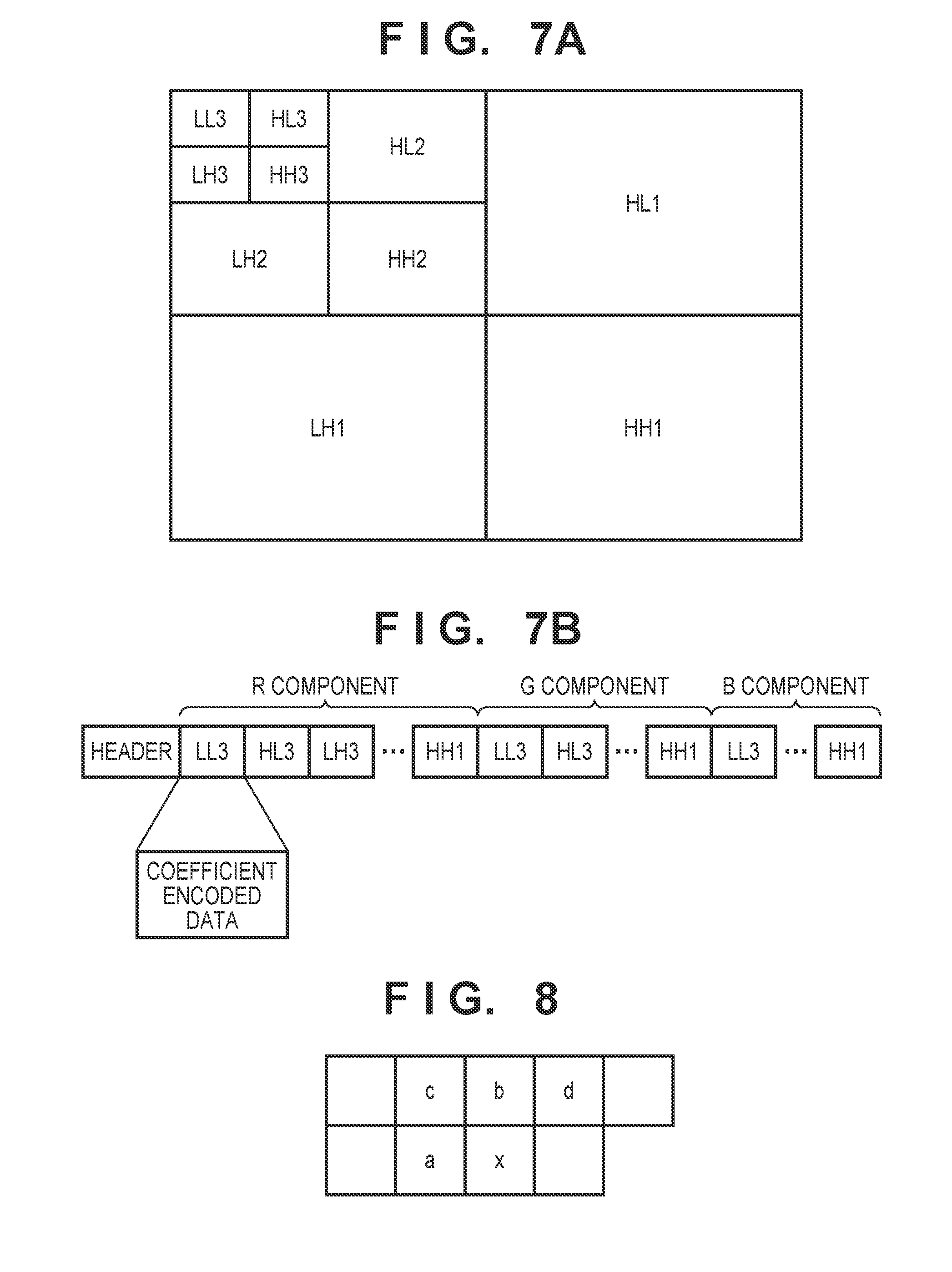 "FIG. 7A explains an example in which wavelet transform is executed three times. LL1, HL1, LH1, and HH1 represent the subbands of decomposition level 1, LL2, HL2, LH2, and HH2 represent the subbands of decomposition level 2, and LL3, HL3, LH3, and HH3 represent the subbands of decomposition level 3. Note that a transform target of wavelet transform from the second time is subband LL obtained by immediately preceding wavelet transform, so subbands LL1 and LL2 are omitted, and subband LL obtained by last wavelet transform remains. Also, the horizontal and vertical resolutions of, for example, HL2 are half those of HL1. Subband LH indicates a horizontal-direction frequency characteristic (a horizontal-direction component) of a local region to which wavelet transform is applied. Likewise, subband HL indicates a vertical-direction frequency characteristic (a vertical-direction component), and subband HH indicates an oblique-direction frequency characteristic (an oblique-direction component). Subband LL is a low-frequency component. An integer-type 5/3 filter is used in wavelet transform of this embodiment, but the present invention is not limited to this. It is also possible to use another wavelet transform filter such as a real-type 9/7 filter used in JPEG2000 (ISO/IEC15444|ITU-T T. 800) as an international standard. In addition, the processing unit of wavelet transform can be either a line or image."