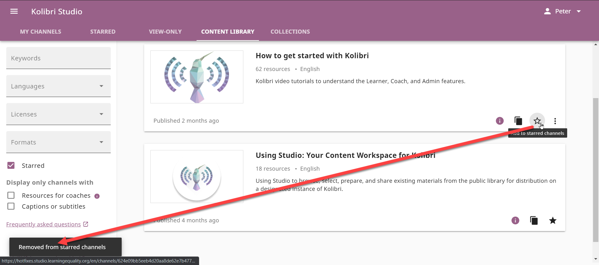 - Click on the star icon of a published channel to add it to the list with starred channels