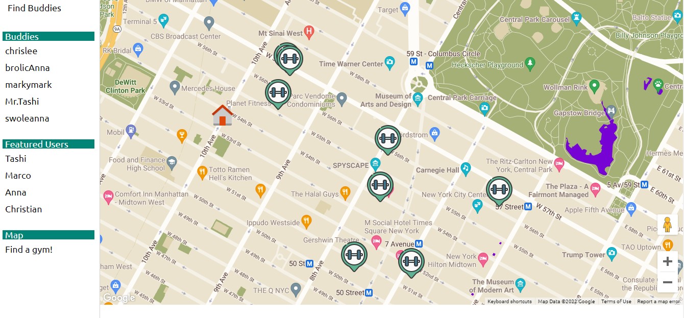 Finally, a next generation site would not be complete without allowing users to find a gym near them. Thus, we have graciously added the google maps API to help users find nearby gyms.