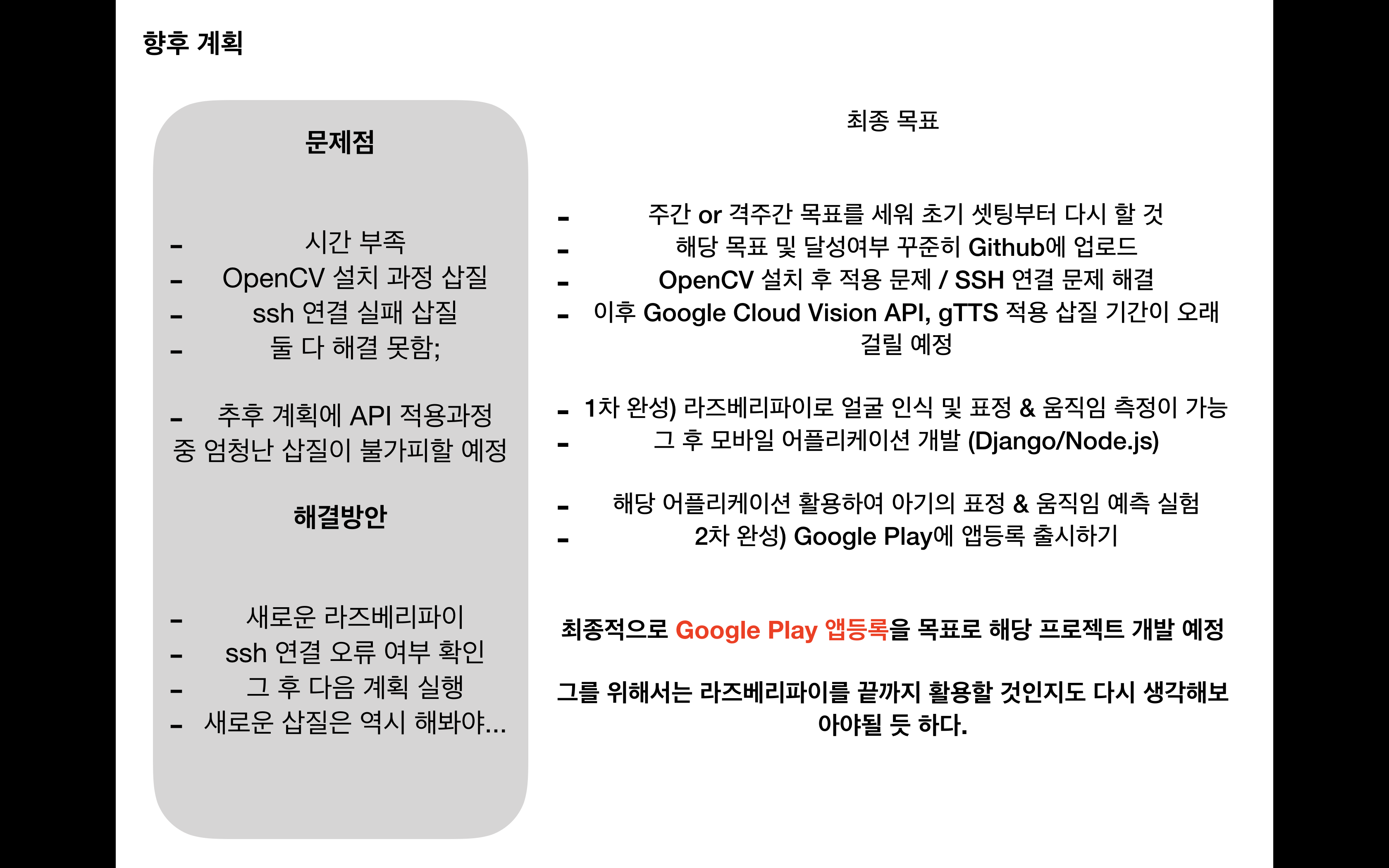 - 실습계획: openCV를 설치하고 라즈베리파이에서 동영상 및 사진을 돌려서 얼굴인식이 잘 되는지 확인해보는 것