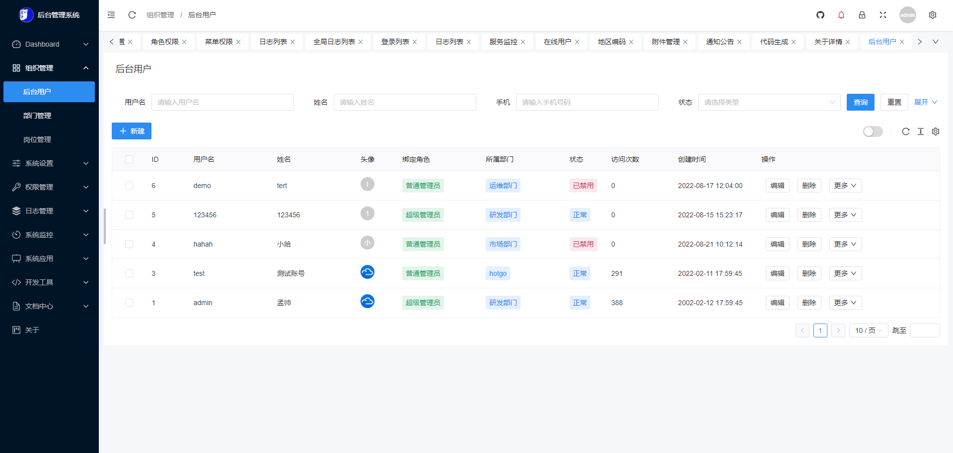 - 部门管理:配置系统组织机构(公司、部门、岗位),树结构展现支持数据权限。