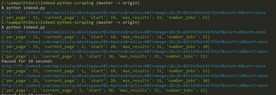 $ python indeed.pyhttp://fr.indeed.com/emplois?q=développeur&l=Nantes&radius=0&fromage=1&vjk=8651b9be54b7b5ef&start=20&sort=date