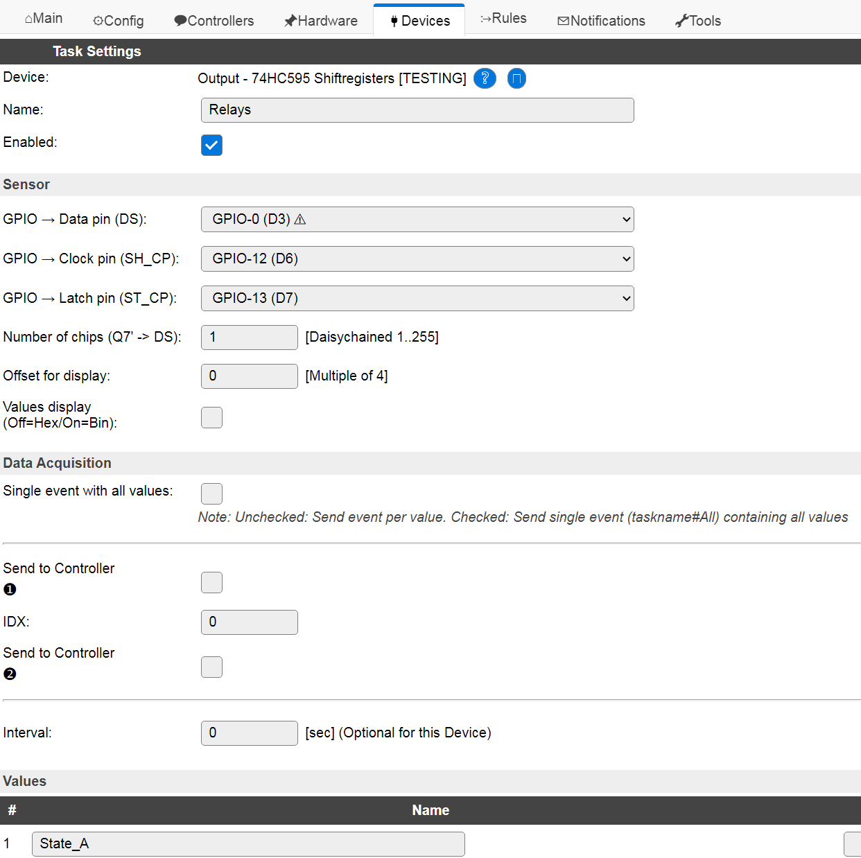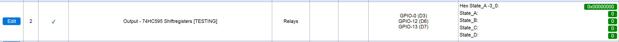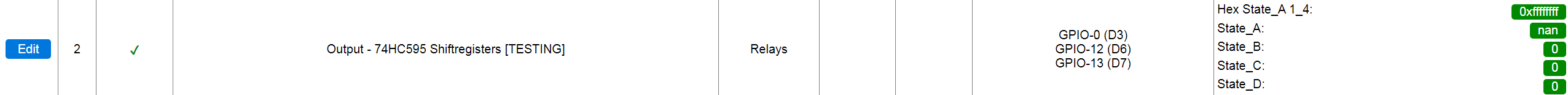 16255 74HC595 (and compatible) shift-registers, connected in a daisy-chain, as supported by these chips.(More daisy-chained chips can easily be supported, but the state can't be displayed on the Devices page)Includes an 'un-templated' (to avoid code duplication) version of the Simsso (Timo Denk)