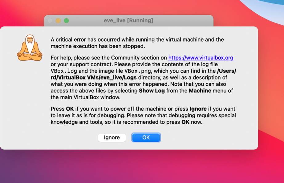 @gkodali-zededa Please consider this ticket https://www.virtualbox.org/ticket/20175. We still have problems running on macOS with VirtualBox. Fix will reach the release version soon, but not there yet. |
