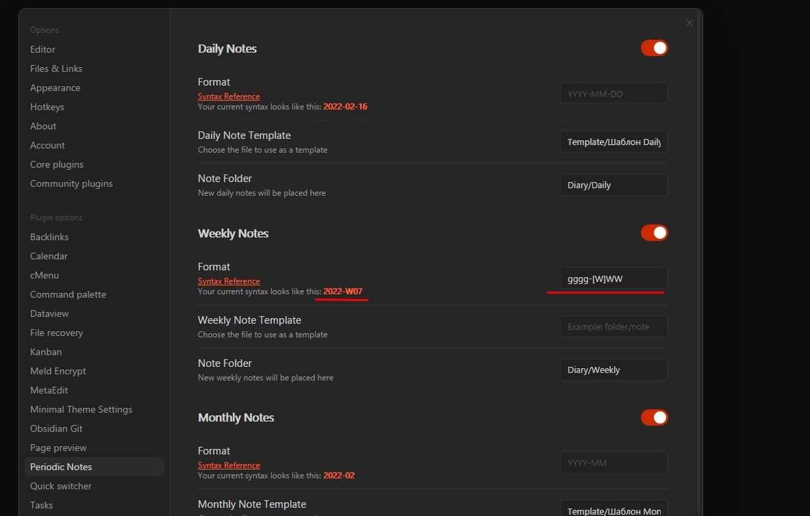 Today is the seventh week. In the "Weekly Notes" setting, in the "Format" field, set the value "gggg-[W]WW". But when trying to create it, it writes me an error: Unable to create a new file.