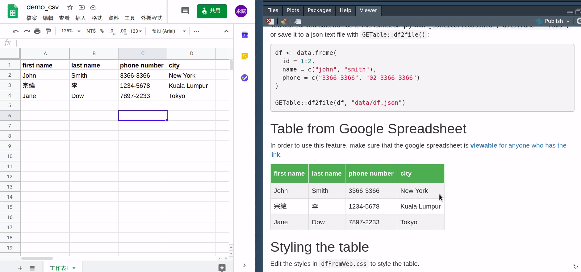 GETable lets you insert dynamic HTML tables in R Markdown documents. "Dynamic" in the sense that the data are not hard-coded into output HTML documents but are requested from Google Spreadsheets or hosted JSON/CSV files when the user visit the web page. This mean that you can update the data without recompiling the .Rmd document!