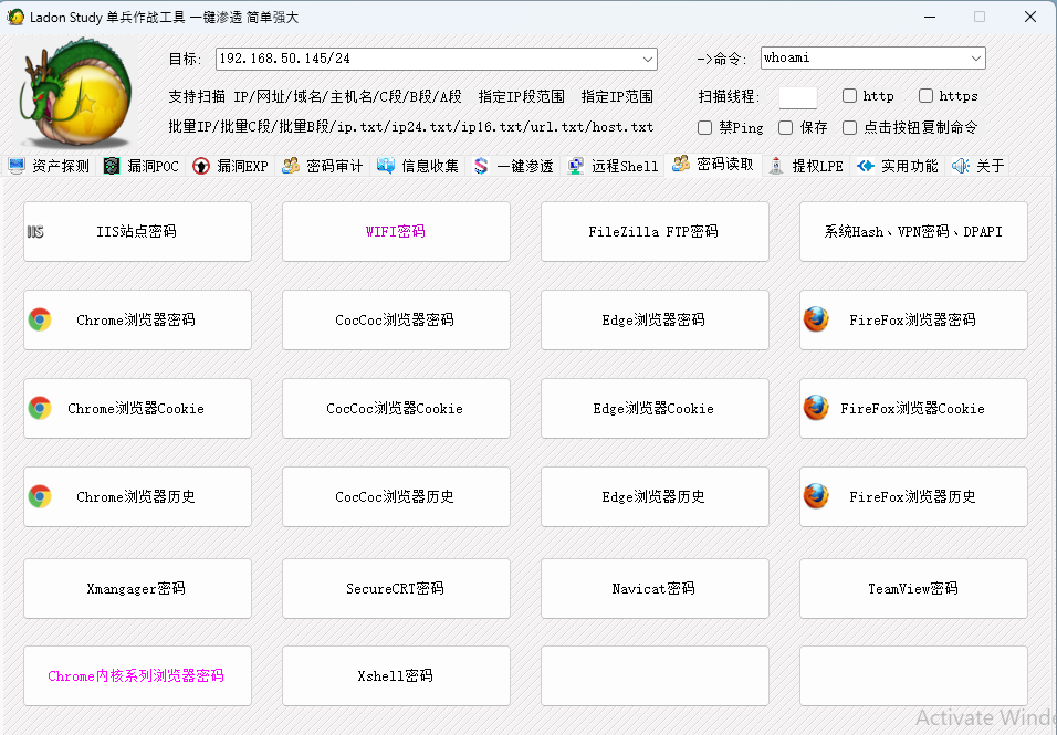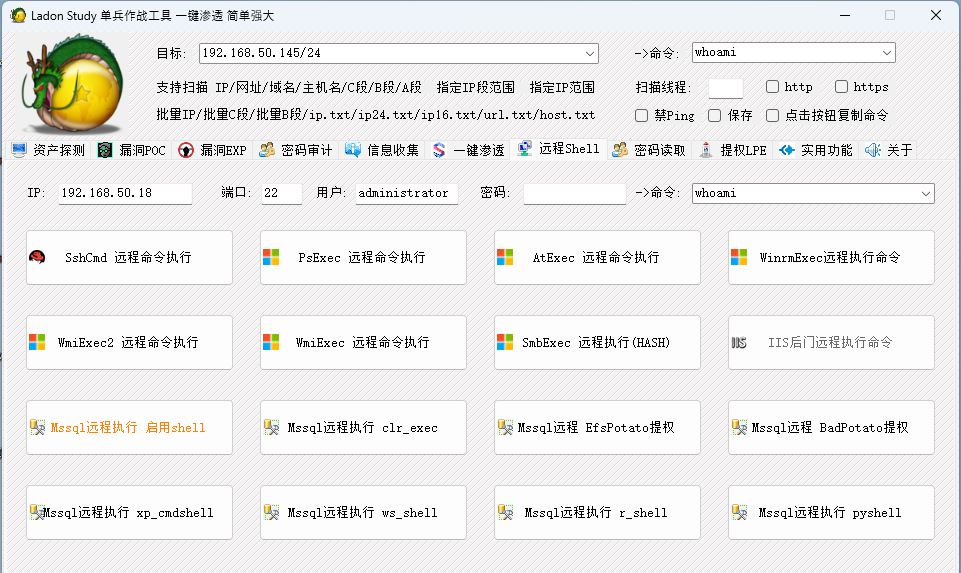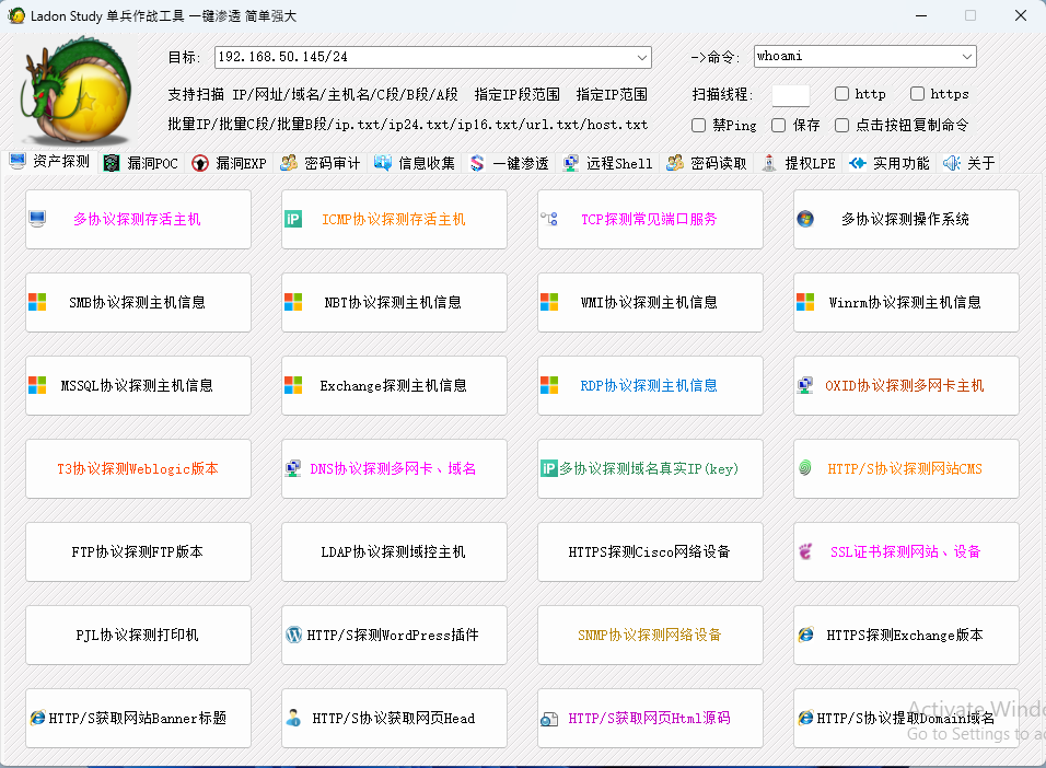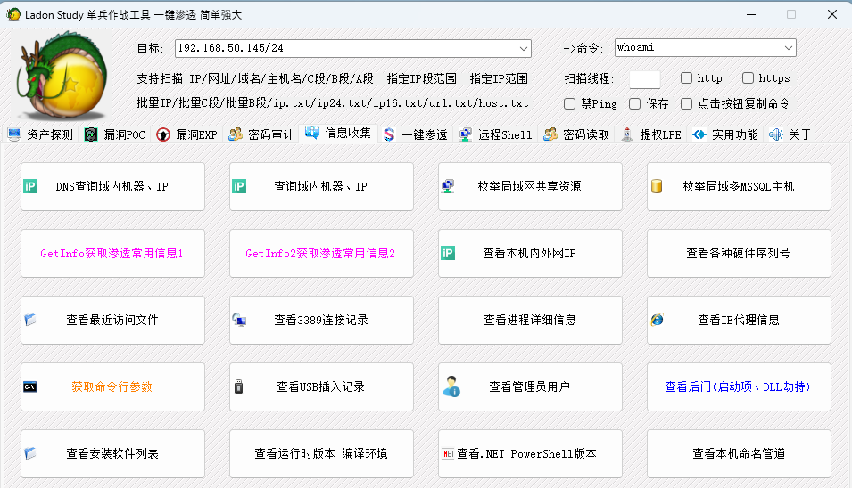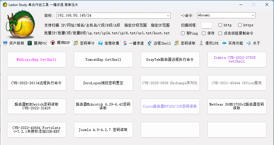 Ladon 192.168.1.8/24 OxidScanLadon 192.168.1.8/24 DnsScanLadon 192.168.1.8/24 OnlineIPLadon 192.168.1.8/24 MS17010Ladon 192.168.1.8/24 SMBGhostLadon 192.168.1.8/24 WebScan