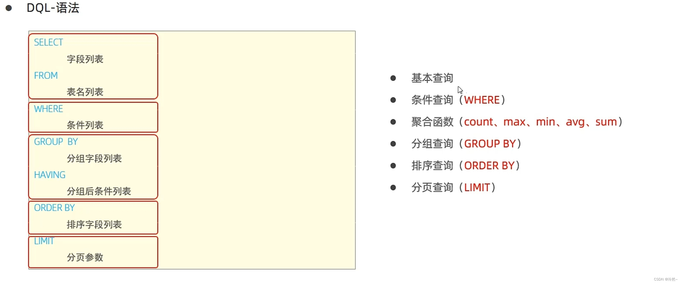 DQL | Data Query Language | 数据查询语言,用来查询数据库中的表的记录 |
