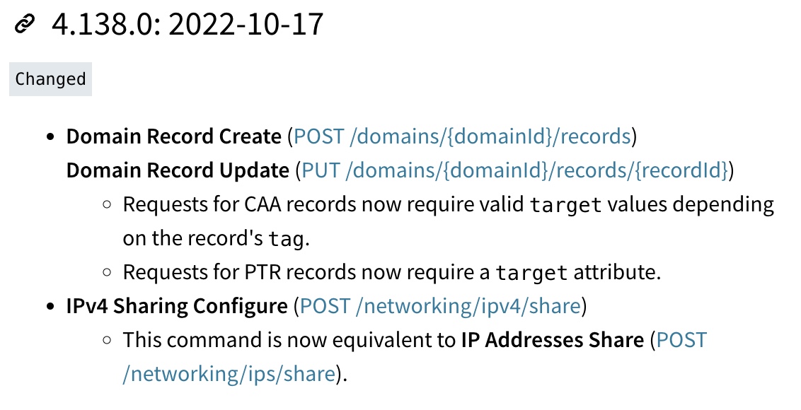 | * **Domain Record Create** ([POST /domains/{domainId}/records](https://www.linode.com/docs/api/domains/#domain-record-create)) |