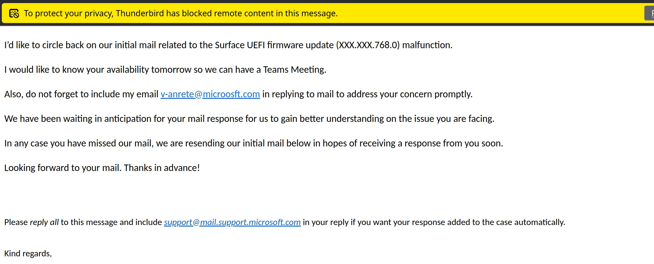 Here's some update, I received Microsoft reply to my support ticket. If you have anything related need to tell them or you want to join the meeting. |