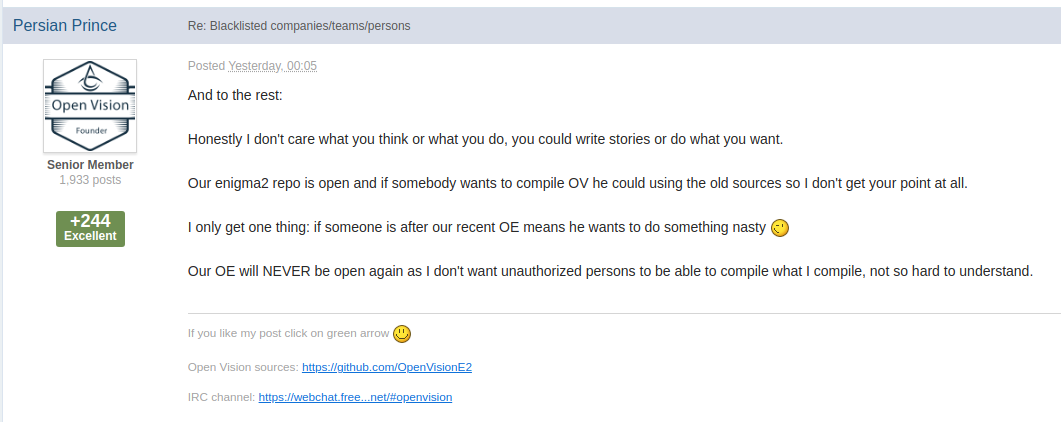 - DMM (DreamBox) company which did close their enigma2 sources years ago.