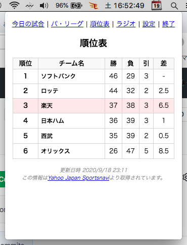メニューバー常駐型のアプリケーションで、当日の試合状況の表示や通知、Rakuten.FM TOHOKUの聴取等ができます。