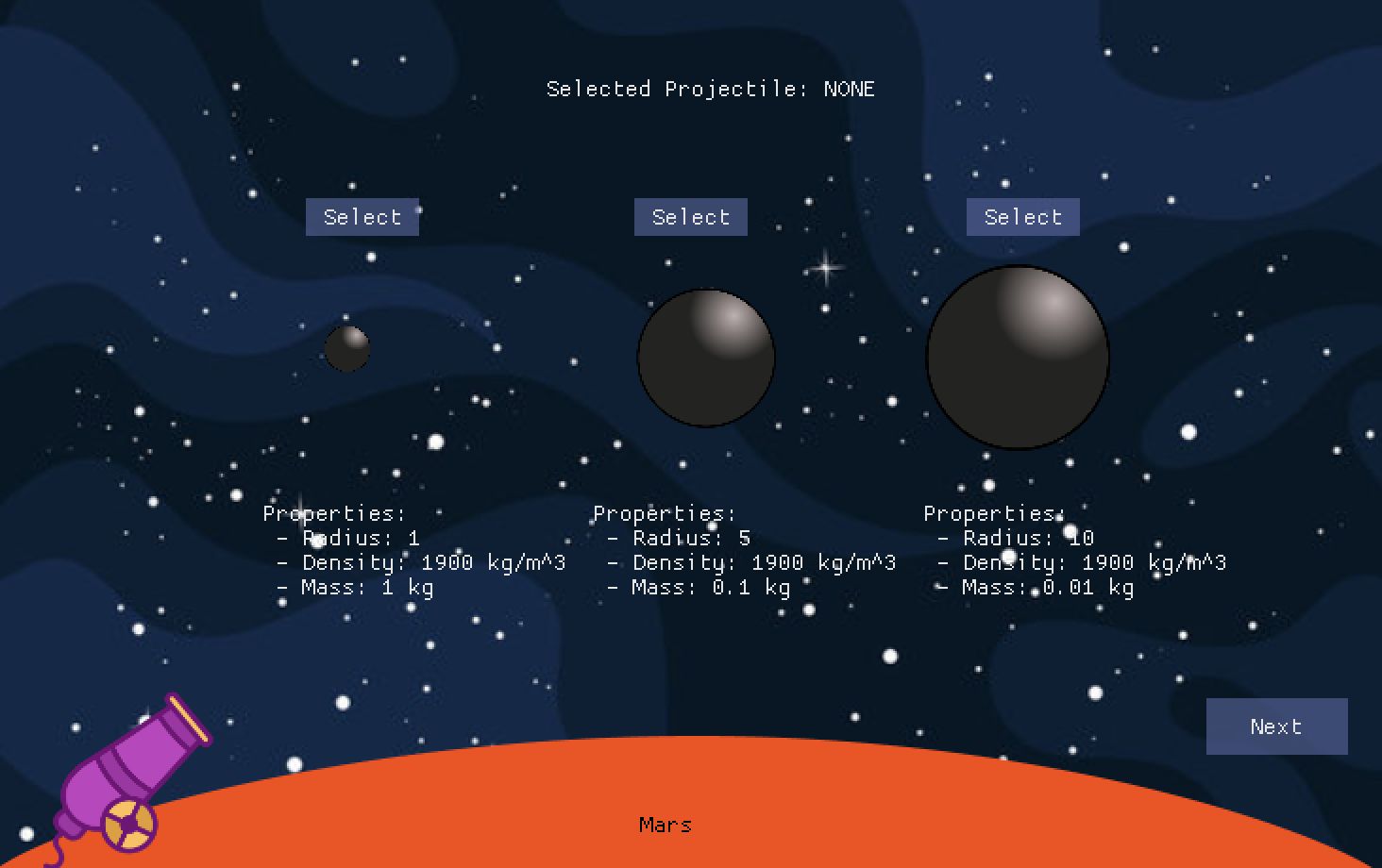 The proposed application is a physics simulation that models the behaviour of non-Newtonian projectiles in a range of different environments (planets). The project will focus both on the algorithms/physics behind non-Newtonian motion, in addition to demonstrating the concepts through a user-friendly interface. Users can select the activity and environment, and travel through “space” on their rocket, exploring the various activities as a cartoon astronaut.