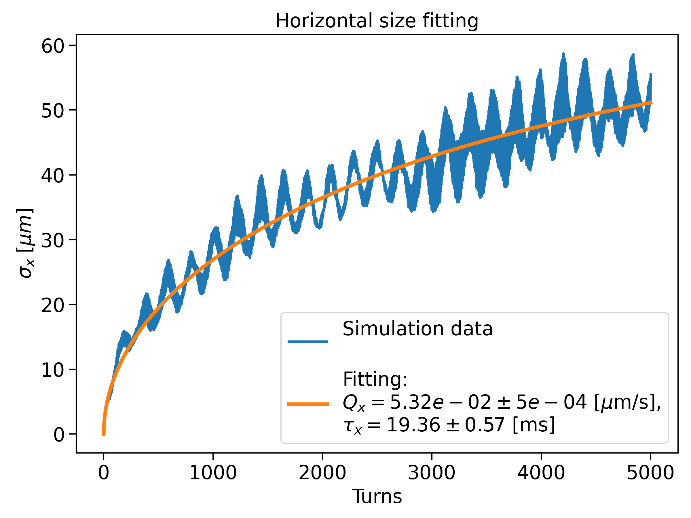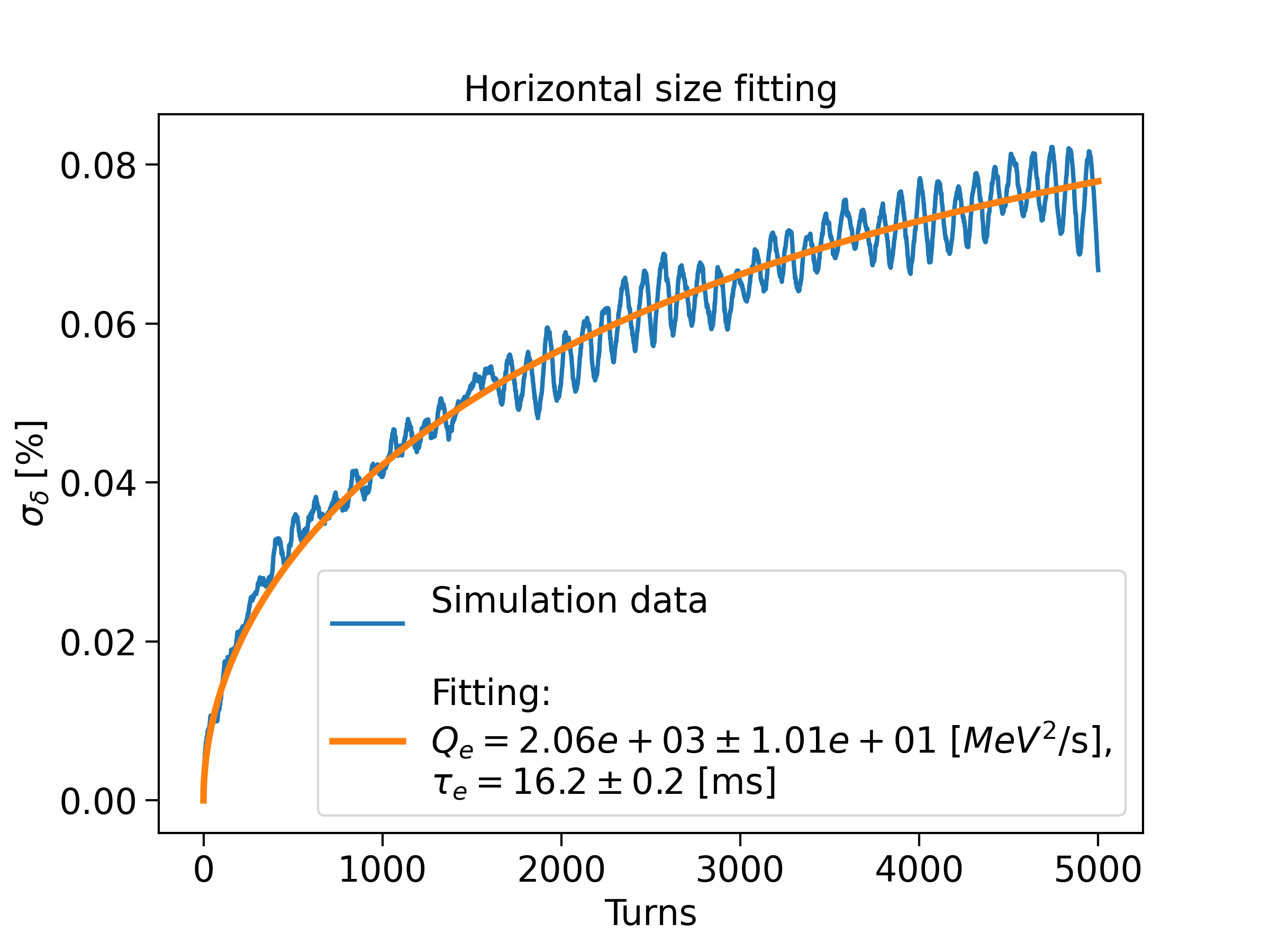 The above simulation was repeated in a model without coupling and for fewer turns (5000). In the absence of coupling, the beam size growth and the energy deviation evolution are simply described by the following equations: